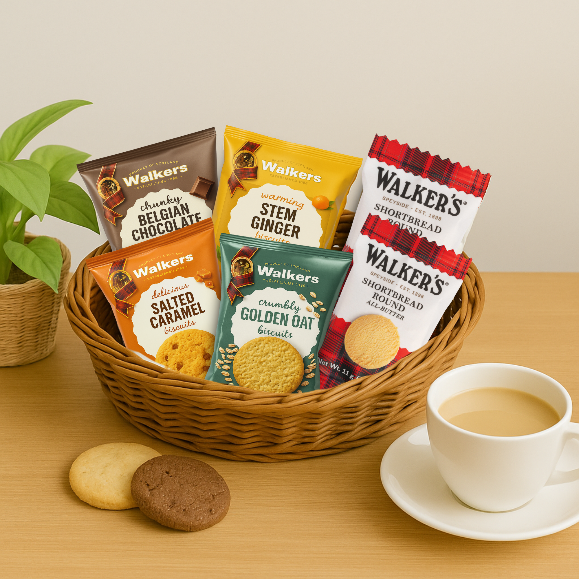 Walkers shortbread assortment displaying Belgian Chocolate, Stem Ginger, Golden Oat, Salted Caramel & mini rounds
