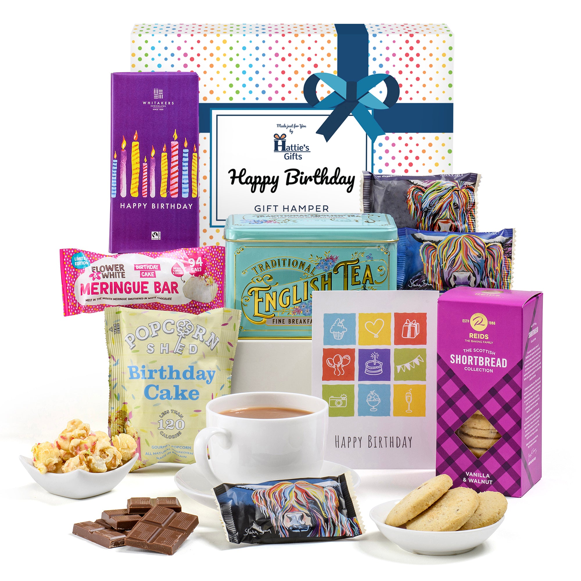 Delight the special man in your life with this gourmet tea hamper, the perfect birthday gift for him. Curated by Hattie's Gifts, this thoughtful afternoon tea gift set for two includes a premium Victorian-style tea tin, vanilla & walnut shortbread, buttery shortbread thins, a birthday cake meringue bar, a celebratory milk chocolate bar, and festive birthday cake-flavoured popcorn. It also includes a cheerful birthday card to complete the experience.
