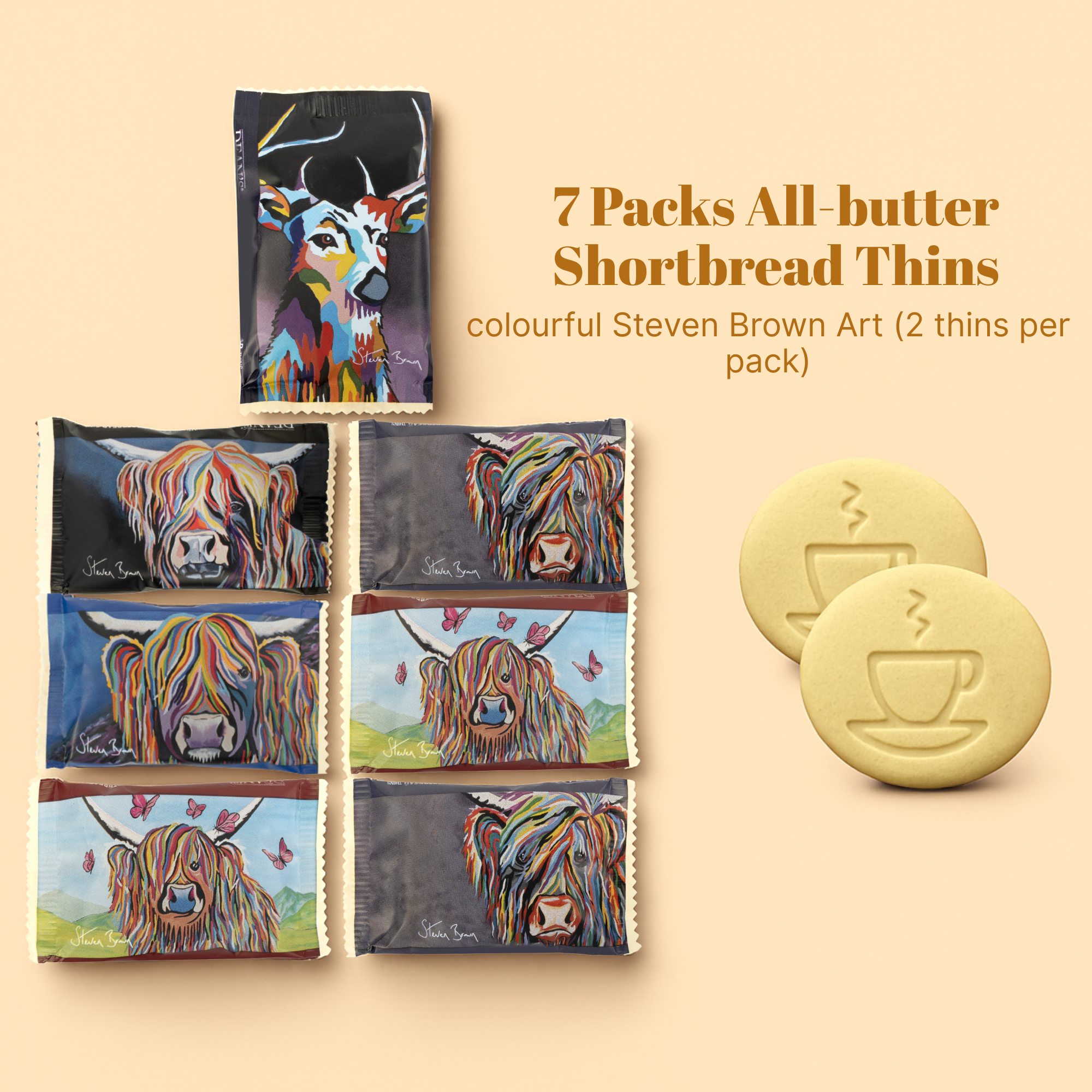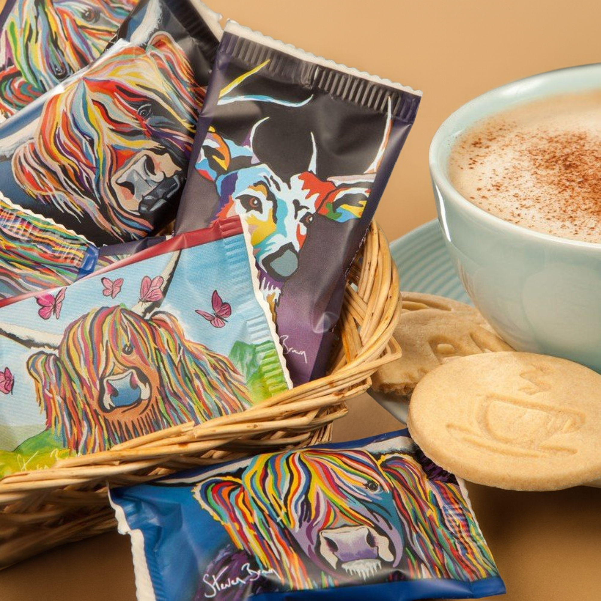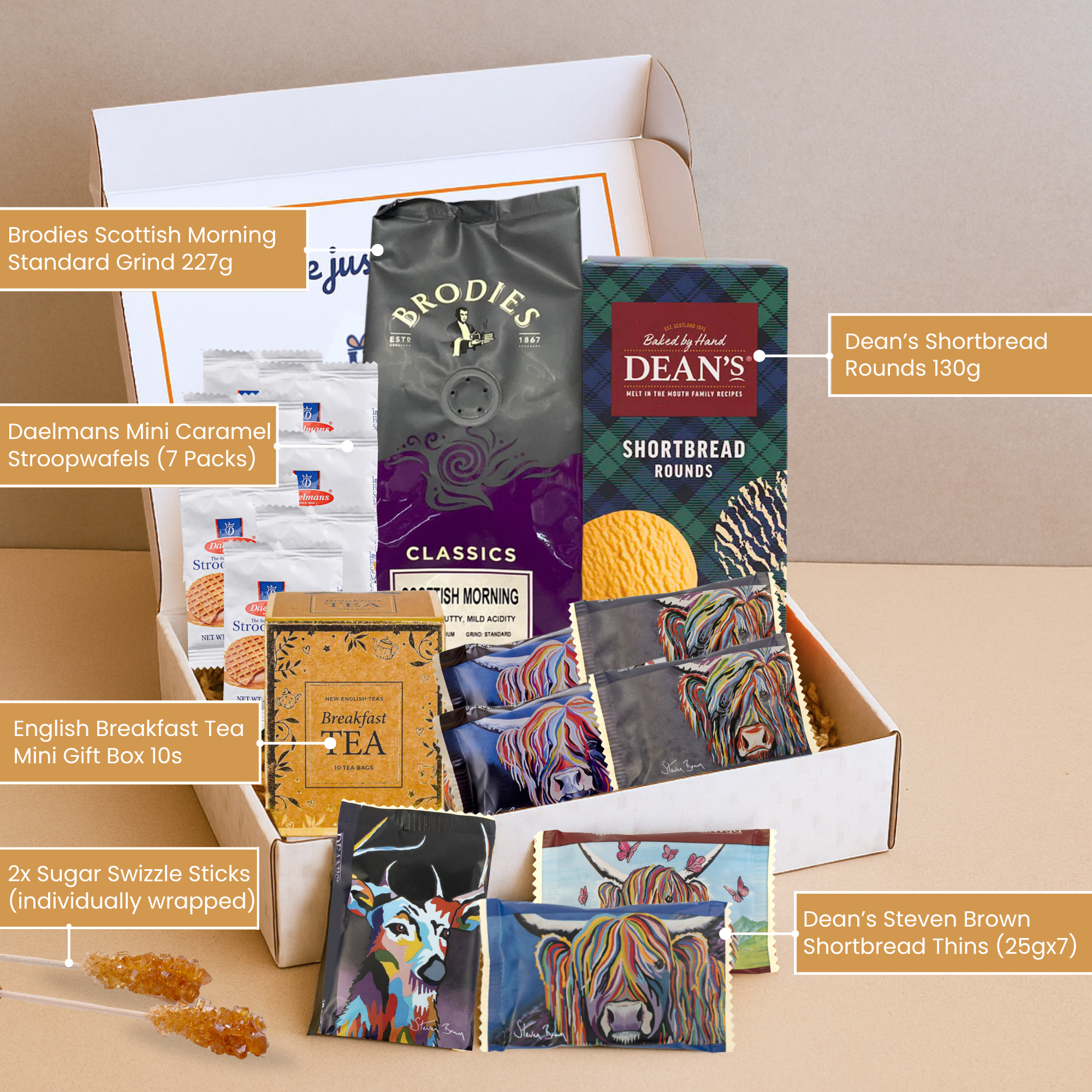 • Coffee Lover's Coffee Gift Set - Includes Brodies Scottish Morning, Dean's Shortbread Rounds, Deans Steven Brown Highland Cow Shortbread Thins, Daelmans Caramel Stroopwaffles, Brown Sugar Swizzle Sticks, English Breakfast Tea - the perfect coffee gifts for men or women!