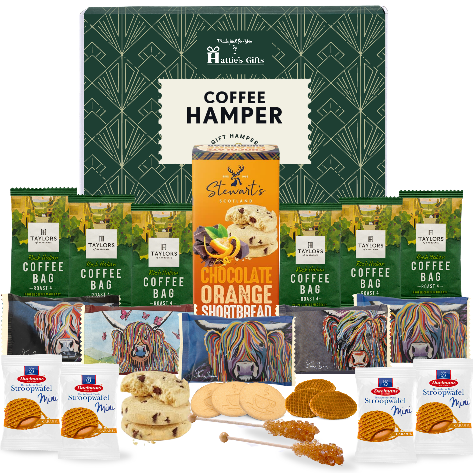 Treat someone special—or yourself—to the ultimate coffee gift hamper filled with luxurious delights. This 18-piece gift set is crafted for coffee connoisseurs, combining Taylors of Harrogate coffee bags with irresistible sweet treats like chocolate orange shortbread, buttery Scottish biscuits, gooey stroopwaffles, and sugar swizzle sticks. Perfectly curated to enhance every coffee moment, it’s a standout gift for men, women, friends or colleagues.