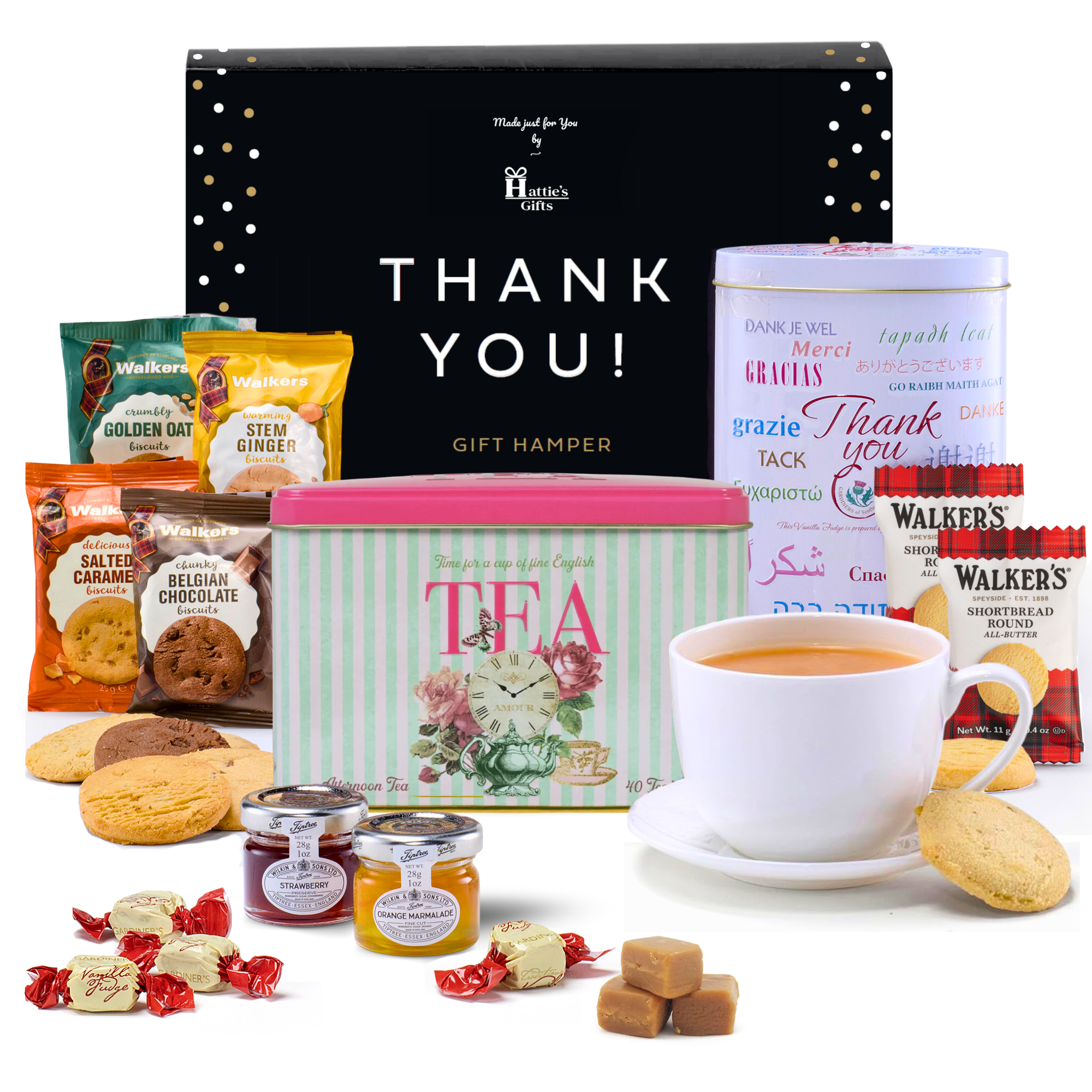 Surprise someone special with the Hattie’s Gifts Thank You Hamper—an indulgent afternoon tea gift box designed to say “thank you” in the most heartfelt way. Inside, you’ll find a classic tin of New English Teas English Breakfast Tea, melt-in-your-mouth Gardiners Vanilla Fudge in a “Thank You” tin, traditional Walker’s Shortbread, and assorted biscuits to complete the perfect tea break.